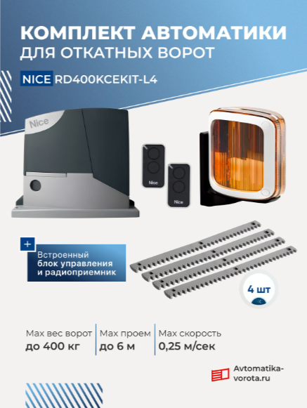Комплект для откатных ворот NICE RD400KCEKIT-L4 с автоматикой