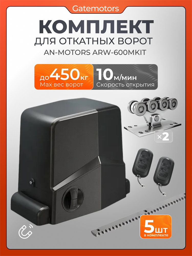 ARW600mkit Привод для откатных ворот AN-Motors ARW-600 MKIT предоставляет высокое качество и надежность. Этот комплект, созданный брендом Alutech, идеально подходит для автоматизации откатных ворот в частных домах и промышленных объектах. Устройство предназначено для легкой и быстрой установки, что позволяет вам сэкономить время и силы при монтаже. AN-Motors ARW-600 MKIT оснащен мощным мотором, который обеспечивает бесперебойную работу ворот, независимо от погодных условий. Это делает привод идеальным для использования в любых климатических условиях. В электродвигателях AN-Motors ARW используется медная обмотка, а не алюминиевая. Такое решение исключает риски переламывания проводки под изоляцией при работе автоматики и защищает мотор от перегрева, повышая производительность и продлевая срок службы привода. Между мотором и шестерней в приводах AN-Motors ARW стоит цельный червячный вал. Цельная конструкция вала дольше сохраняет работоспособность при вибрациях и ударных нагрузках. Надежный вал продлевает срок службы автоматики. Основные характеристики привода для откатных ворот AN-Motors ARW-600 MKIT включают: