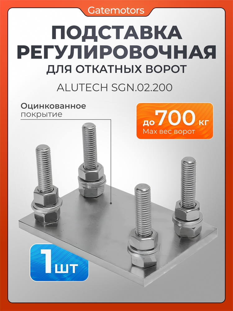 Регулируемая подставка Alutech SGN.02.200 используется с консольными системами SG02, рассчитанными на нагрузку до 700 кг. Подставка предназначена для монтажа роликовых опор SGN.02.100, SGN.02.150. Установка подставки выполняется с использованием анкерных болтов либо посредством сваривания ее с элементом, заранее установленным в фундамент.