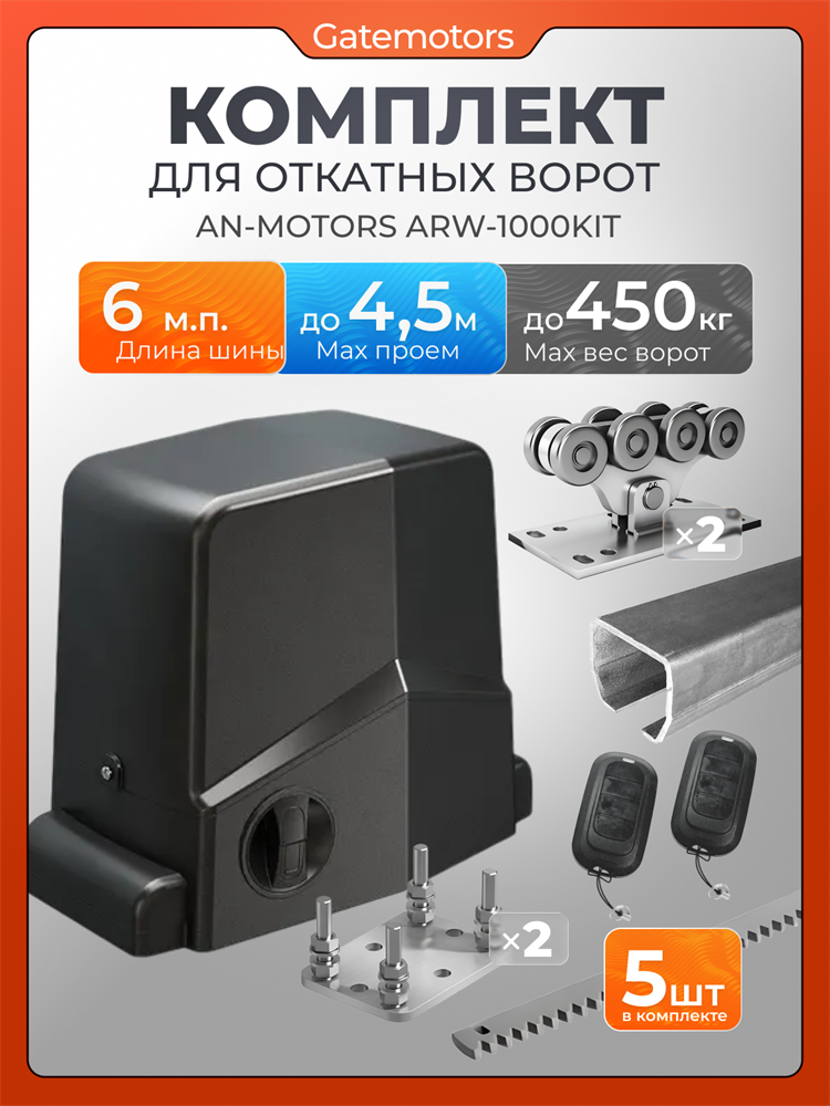 ARW1000KIT Привод для откатных ворот AN-Motors ARW-1000 KIT предоставляет высокое качество и надежность. Этот комплект, созданный брендом Alutech, идеально подходит для автоматизации откатных ворот в частных домах и промышленных объектах. Устройство предназначено для легкой и быстрой установки, что позволяет вам сэкономить время и силы при монтаже. AN-Motors ARW-1000 KIT оснащен мощным мотором, который обеспечивает бесперебойную работу ворот, независимо от погодных условий. Это делает привод идеальным для использования в любых климатических условиях. В электродвигателях AN-Motors ARW используется медная обмотка, а не алюминиевая. Такое решение исключает риски переламывания проводки под изоляцией при работе автоматики и защищает мотор от перегрева, повышая производительность и продлевая срок службы привода. Между мотором и шестерней в приводах AN-Motors ARW стоит цельный червячный вал. Цельная конструкция вала дольше сохраняет работоспособность при вибрациях и ударных нагрузках. Надежный вал продлевает срок службы автоматики. Основные характеристики привода для откатных ворот AN-Motors ARW-1000 KIT включают: