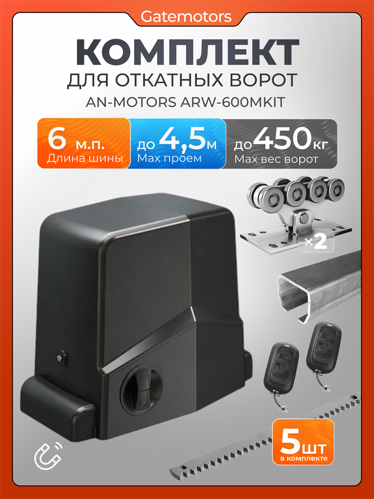 ARW600mkit Привод для откатных ворот AN-Motors ARW-600 MKIT предоставляет высокое качество и надежность. Этот комплект, созданный брендом Alutech, идеально подходит для автоматизации откатных ворот в частных домах и промышленных объектах. Устройство предназначено для легкой и быстрой установки, что позволяет вам сэкономить время и силы при монтаже. AN-Motors ARW-600 MKIT оснащен мощным мотором, который обеспечивает бесперебойную работу ворот, независимо от погодных условий. Это делает привод идеальным для использования в любых климатических условиях. В электродвигателях AN-Motors ARW используется медная обмотка, а не алюминиевая. Такое решение исключает риски переламывания проводки под изоляцией при работе автоматики и защищает мотор от перегрева, повышая производительность и продлевая срок службы привода. Между мотором и шестерней в приводах AN-Motors ARW стоит цельный червячный вал. Цельная конструкция вала дольше сохраняет работоспособность при вибрациях и ударных нагрузках. Надежный вал продлевает срок службы автоматики. Основные характеристики привода для откатных ворот AN-Motors ARW-600 MKIT включают: