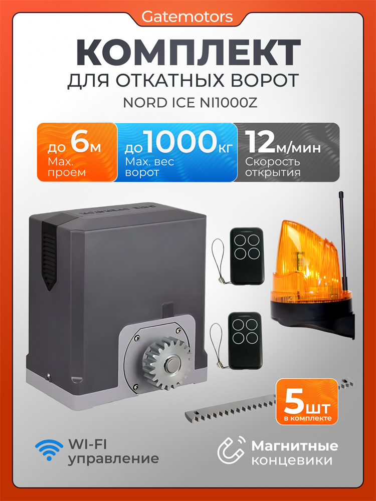 Привод для откатных ворот NORD ICE NI1000Z с зубчатыми рейками и сигнальной лампой