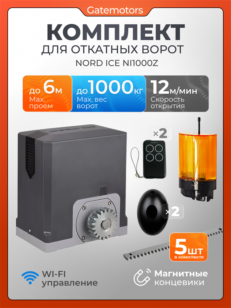 Привод для откатных ворот NORD ICE NI1000Z с зубчатыми рейками, сигнальной лампой и фотоэлементами